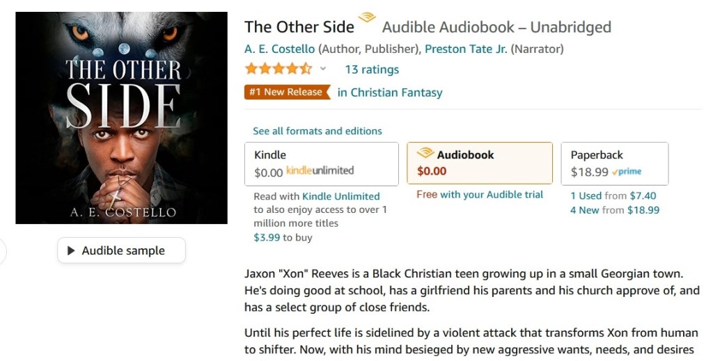 The Other Side is a young adult Christian fantasy about Jaxon “Xon” Reeves, a Black Christian teen who is turned into a werewolf. Now that Xon is not human, but a shifter, he is apart of the shifter world, and he must learn how to deal with his new wolf side, and fight with his own faith as a child of God.